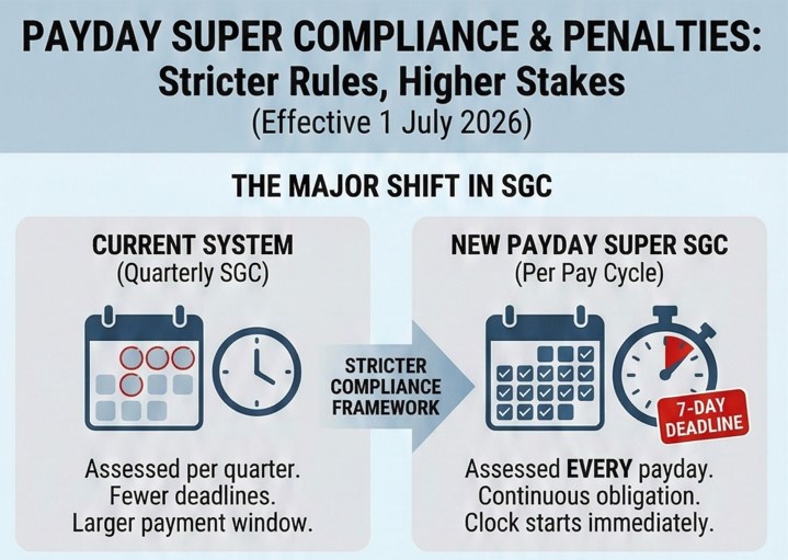 Under today’s rules, if you miss a quarterly super deadline, you face the Superannuation Guarantee Charge (SGC). It’s not pleasant, but the quarterly cycle means you have larger windows and fewer deadlines to manage.