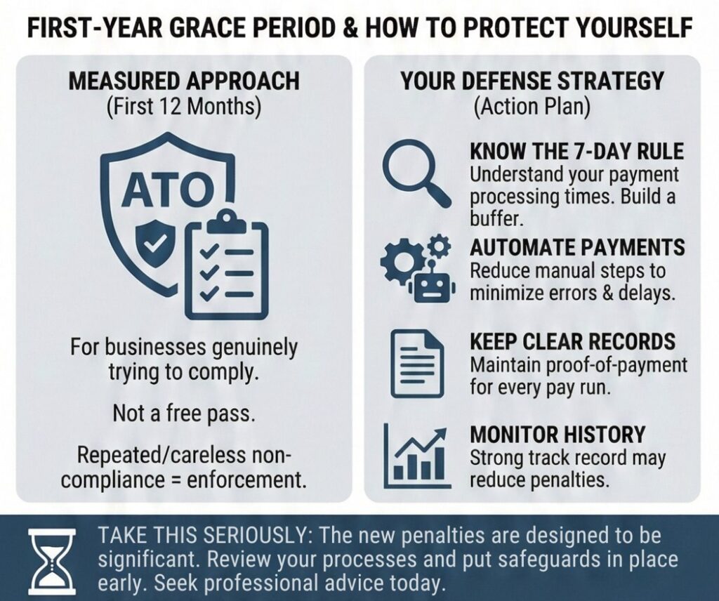 The ATO has said it will take a “measured approach” to compliance during the first 12 months. In practice, this means they’ll differentiate between businesses that are genuinely trying to comply and those that aren’t.
